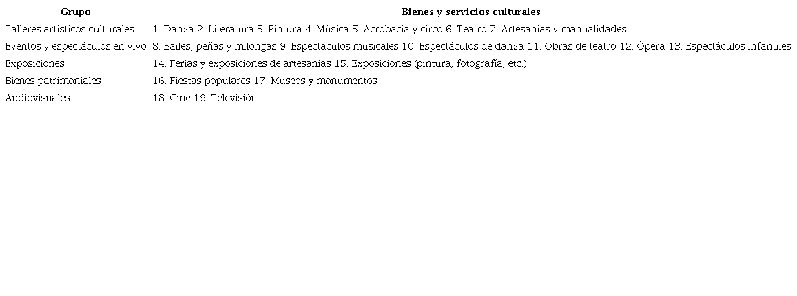 II. Se midió el nivel del consumo cultural a partir del Índice de Acceso al Consumo Cultural (IACC) desarrollado por Leonardi et al. (2020). El IACC está compuesto por una canasta de 19 bienes culturales (tabla 1). Para cada uno de los bienes culturales considerados se asigna valor uno, si el individuo lo consume, y valor 0, si no lo consume. El valor del IACC surge de la adición de estos consumos (no consumos) parciales. En consecuencia, el indicador varía en el rango [0; 19]. Luego se estratificó la variable en cinco niveles: [0] indica que no se verifica consumo cultural en el periodo de análisis; [1; 5] indica un consumo cultural bajo; [6; 10], consumo cultural mediobajo; [11; 15], consumo cultural medio-alto y [16; 19] consumo cultural alto. Así, el consumo cultural bajo implica que el individuo sólo consumió cinco o menos bienes o servicios culturales durante 2019. El resto de las categorías se interpretó de forma análoga.