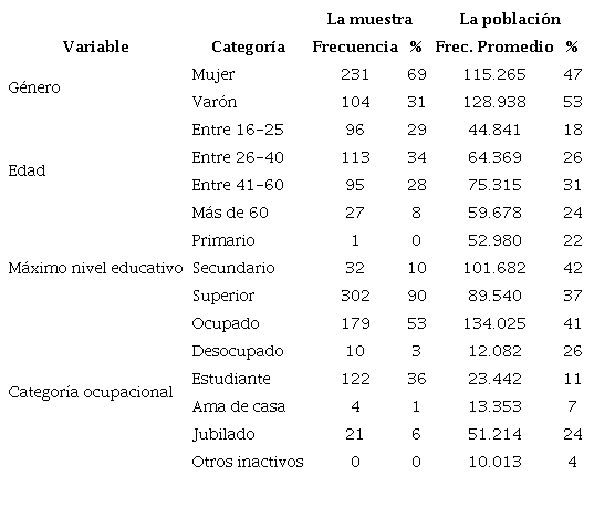 Sin embargo, para asegurar su representatividad, primero se comparó la composición de la muestra en relación con la de la población bahiense mayor de 16 años desde dos perspectivas: sociodemográfica y socioeconómica. En cuanto a la comparación en términos sociodemográficos se consideraron las siguientes variables: género (mujer-varón), edad (entre 16 y 25 años; entre 26 y 40; entre 41 y 60; más de 60), nivel educativo (primario, secundario, superior) y categoría ocupacional (ocupado, desocupado, inactivos), de las cuales destacan las subcategorías: estudiante, ama de casa y jubilado. Para realizar esta comparación se estudió la población bahiense mayor de 16 años a partir de la Encuesta Permanente de Hogares realizada por Indec (2019), ésta se llevó a cabo de forma trimestral, por lo que aquí se tomaron en cuenta los valores promedio de los cuatro trimestres de 2019 de las variables de interés. Asimismo, se comparó la distribución geográfica de los encuestados, en relación con la de la población bahiense, considerando la proporción de cada uno de ellos que habita en cada barrio de la ciudad.