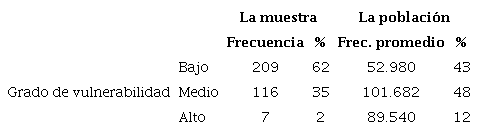 La Tabla 3 resume la comparación del grado de vulnerabilidad del barrio de residencia entre los encuestados y la población bahiense. El Mapa 2 representa espacialmente esta situación. Se observa que la proporción de encuestados que viven en barrios no vulnerables es mayor que la de la población en general. Similarmente, la proporción de encuestados que habita en barrios con condiciones sociales y habitacionales más comprometidas es menor que la de los bahienses en general.