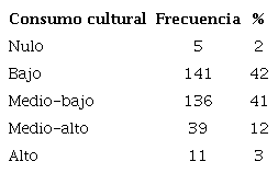 La Tabla 4 presenta el nivel de consumo cultural de los encuestados, según el cálculo del IACC. La mayoría de los encuestados presenta un consumo cultural bajo (42%) o medio-bajo (41%). Le siguen en importancia aquéllos que manifiestan un consumo cultural medio-alto (12%). En los extremos, sólo 3% de la muestra un consumo cultural alto y 2% no consumió los bienes culturales de la canasta especificada en la Tabla 1.