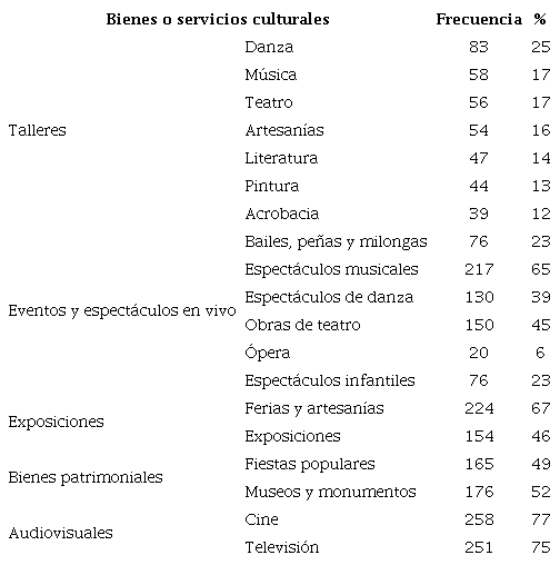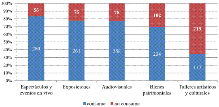 De las 336 personas que respondieron el cuestionario, 331 afirmaron haber consumido al menos uno de los bienes culturales presentados en la Tabla 1. Es decir, 98% de los respondientes consumieron algún tipo de bien cultural durante 2019.