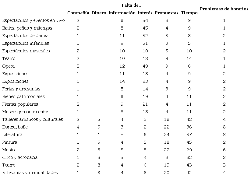 Complementariamente, se estudiaron los principales motivos por los cuales los encuestados decidieron no consumir los bienes culturales de interés. Para ello se presentaron las siguientes opciones: falta de compañía, de información, de interés, de propuestas, de tiempo y problemas con los horarios en los que se puede acceder al consumo cultural. Además, para el caso de los talleres artísticos culturales se consideró como posible obstáculo al consumo la falta de dinero. Estas alternativas no son excluyentes y se decidió cuál fue más generalizada con base en el cálculo de frecuencias absolutas y relativas.