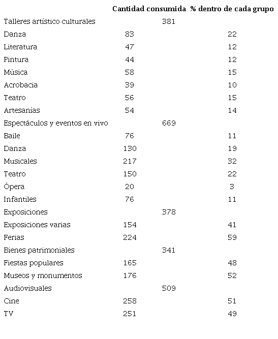 En la Tabla 7 se desglosa la demanda de cada uno de los bienes culturales correspondientes a cada categoría. Se puede observar que, dentro de los talleres, la danza ocupa el primer lugar, seguido de la música, el teatro y las artesanías. Por su parte, la literatura, pintura y acrobacia quedan en último lugar. En el caso de los eventos y espectáculos en vivo, el primer lugar corresponde a espectáculos musicales (33%), le siguen obras de teatro (22%) y danza (20%). Entre las exposiciones predominan las ferias y artesanías sobre las exposiciones de fotografía, escultura y pintura. Las visitas a museos y monumentos son preferidas levemente a las fiestas populares. Por último, respecto a los audiovisuales, la preferencia por el cine es semejante a la de la televisión.