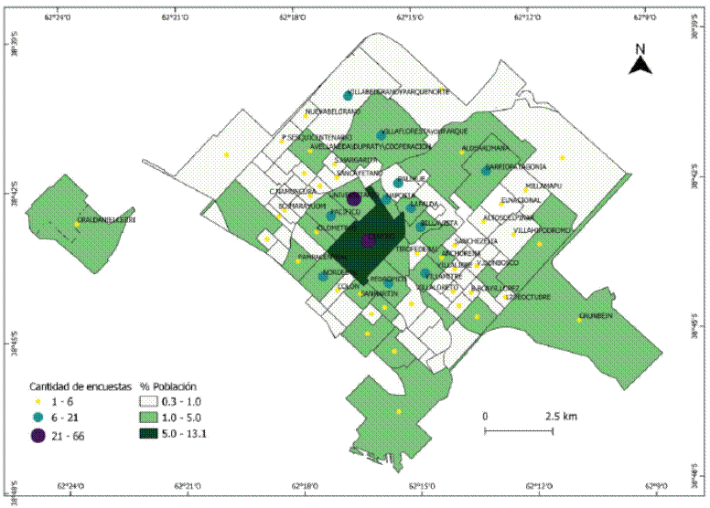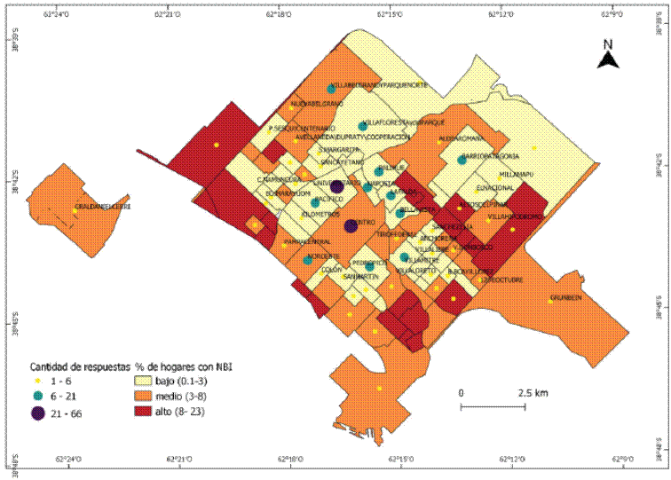 El análisis que combina la esfera socioeconómica y la distribución espacial de la población se realizó con el softwareQGIS (2020), se utilizaron datos del Censo Nacional de Población, Hogares y Viviendas (Indec, 2010) para comparar la composición de la muestra y de la población bahiense en relación con el grado de vulnerabilidad del barrio de residencia y su distribución espacial. Específicamente, se equiparó la cantidad de respuestas obtenidas y la cantidad de personas que habitan en barrios de alta, media y baja vulnerabilidad. Se consideró como medida general de la vulnerabilidad el porcentaje de hogares que tiene al menos una necesidad básica insatisfecha (NBI).