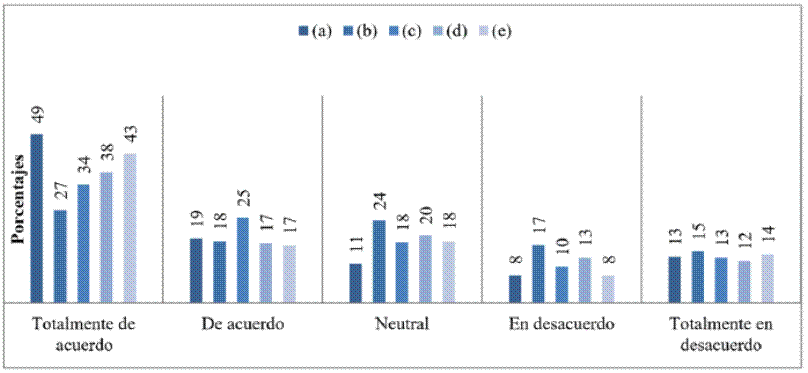 La Gráfica 1 muestra el grado de conformidad de los respondientes con las diferentes definiciones de cultura. En relación con las respuestas que indicaron estar muy de acuerdo, los resultados fueron los siguientes: hábitos, costumbres y comportamientos (48.8%), identidad (43.2%), forma de pensar, ideología y valores (37%), arte y patrimonio (34.2%) y, finalmente, la información, estudiar, conocer (26.8 por ciento).