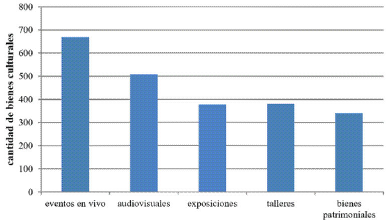 La cantidad demandada de bienes culturales por parte de las personas que respondieron la encuesta fue de 2278 bienes culturales. La Gráfica 3 presenta la cantidad demandada de cada categoría de bienes culturales, la mayor cantidad corresponde a la categoría eventos y espectáculos en vivo (29%), seguido de bienes audiovisuales (22%), talleres artístico culturales y exposiciones (17% cada uno) y bienes patrimoniales (15 por ciento).