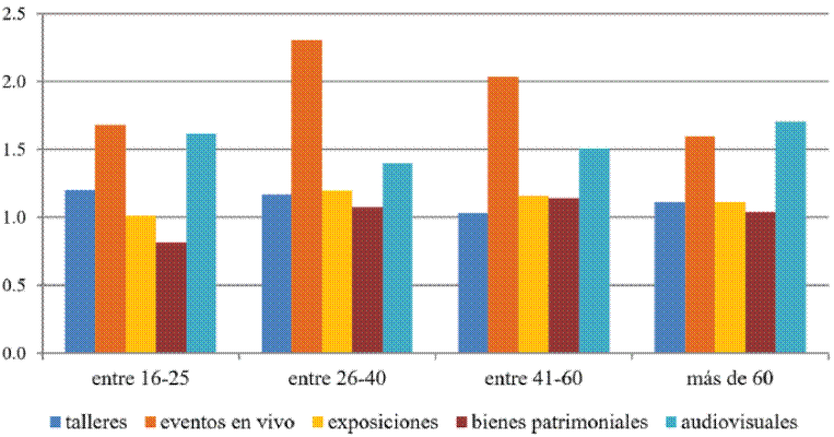 Los resultados ponen de manifiesto que, si bien la mayor cantidad demandada de bienes culturales se asocia al consumo de espectáculos y eventos en vivo, en primer lugar, y de audiovisuales, en segundo lugar, el consumo de talleres artísticos y culturales, exposiciones y bienes patrimoniales es similar. La principal demanda de bienes culturales proviene de los adultos jóvenes de la muestra: entre 26 y 40 años, seguida de los adultos de entre 41 y 60 años. Sin embargo, todos los encuestados mayores de 25 años muestran un consumo per cápita similar, rondan los siete bienes culturales en el año de referencia.