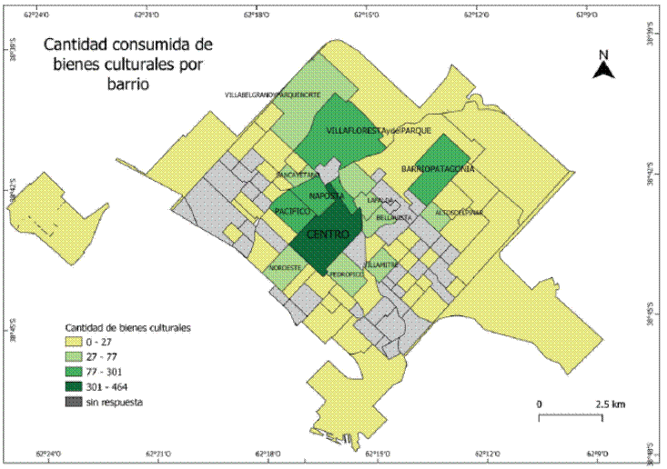 En cuanto a la caracterización espacial del consumo cultural, el Mapa 3 presenta la distribución geográfica del consumo de bienes culturales de los encuestados. El mayor consumo se concentra en el centro de la ciudad, le siguen los barrios Pacífico, Universitario, Napostá, Villa Floresta, Barrio del Parque y Barrio Patagonia, con un consumo de entre 77 y 300 bienes culturales por barrio. Villa Belgrano y Parque Norte, San Cayetano, Bellavista, Palihue, La Falda, Altos del Pinar, Villa Mitre, Pedro Pico y Noroeste presentan menor consumo, el resto de los barrios periféricos presentan un consumo más bajo, de hasta 27 bienes culturales por barrio.