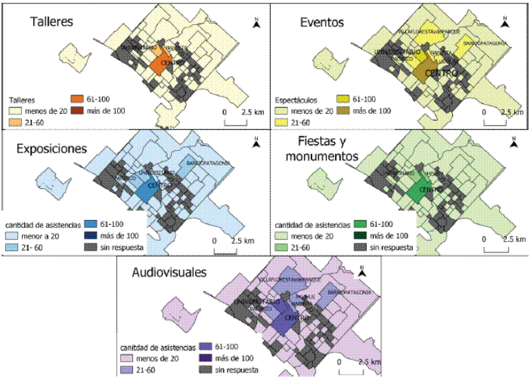El Mapa 4 localiza espacialmente la cantidad de las distintas categorías de bienes culturales consumidas por las personas encuestadas en Bahía Blanca. Para las cinco categorías estudiadas, se observa que el consumo es mayor en el centro de la ciudad. En el caso de los talleres, fiestas populares, museos y monumentos destaca el consumo de los barrios Universitario y Napostá. El barrio Patagonia se suma en el caso de la asistencia a exposiciones y ferias. Finalmente, respecto a la asistencia a eventos y espectáculos en vivo y al consumo de bienes audiovisuales, además de los barrios mencionados, se encuentran Villa Floresta y del Parque, La Falda y Pacífico, entre los principales demandantes.