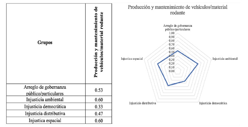 Para ilustrar el efecto de cada uno de los subgrupos con respecto a cada una de las injusticias (grupos), y dado que se ha procedido a cuantificar el efecto de cada sector, se realizaron diagramas radiales, para establecer similitudes o valores atípicos. En el diagrama radial Producción y mantenimiento de la infraestructura ( figura 1) se puede ver que hay una disminución considerable en la injusticia ambiental y un desempeño positivo, pero en menor medida, de la injustica espacial; es decir, la ejecución o modificación de nueva infraestructura produce efectos territoriales importantes, genera proyectos urbanos, produce cierto dinamismo en los usos del suelo, distribuye y concentra viajes, reduce excesivos arranques y detenciones, generando impactos ambientales positivos.