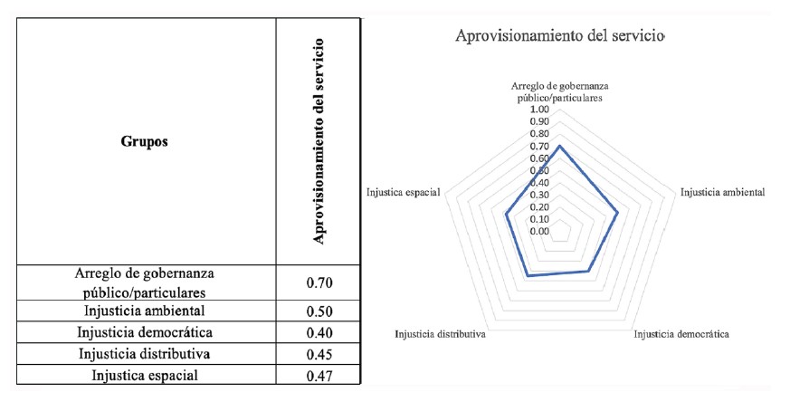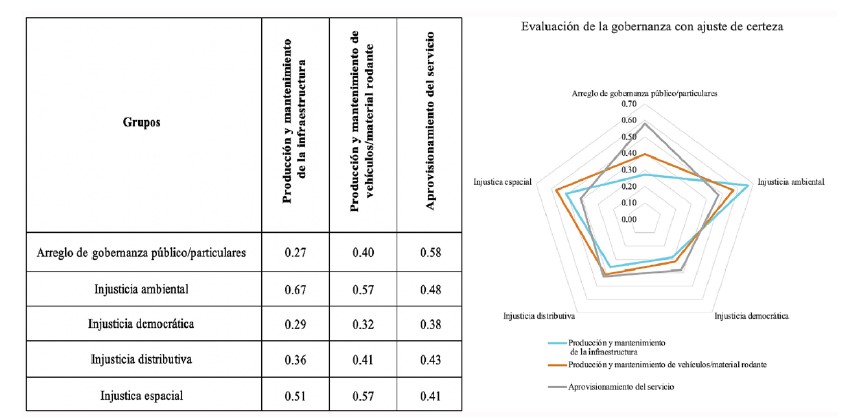 Por otro lado, como aspectos negativos se define que la injusticia democrática tiene el peor desempeño con una reducción menor, coincidente con el resultado general de la evaluación. De igual manera, la justicia distributiva tiene que ver con los subsidios, las ganancias de los operadores y el poder político, con rendimientos menores a 50%. Algo similar sucede con el arreglo de gobernanza, que define una inadecuada negociación entre públicos y privados, condiciones de servicio ambiguas e intereses privados y políticos latentes que reducen la injusticia en 43%, aproximadamente ( figura 1).