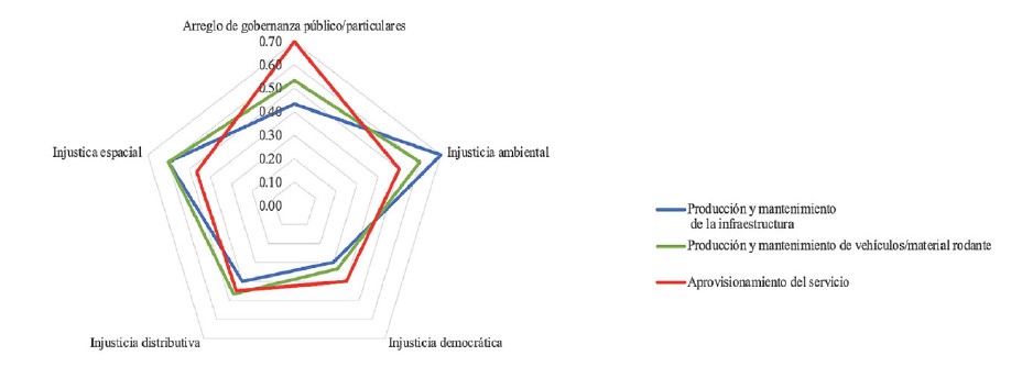 Un diagrama comparativo de las injusticias puede verse en la figura 4, toda vez que, mientras la infraestructura, los vehículos y el material rodante generan desempeños aceptables en la injusticia ambiental y espacial, la provisión del servicio hace lo mismo para el arreglo de la gobernanza entre instituciones públicas y particulares. Además, las injusticias democrática y distributiva tienen serias deficiencias, llegando a valores por debajo de 50 por ciento.