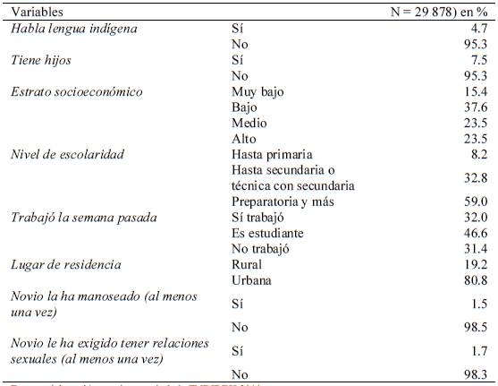 El 78.1 por ciento (N = 29 878) de la muestra de la ENDIREH (2011) son mujeres solteras (nunca unidas) de 15 a 29 años de edad. Su edad media es de 19.8 años siendo la mediana 19 años. Como se aprecia en el cuadro siguiente (Cuadro 1) 7.5 por ciento sí tiene hijos y entre éstas, 28.7 por ciento tuvo su primer hijo cuando tenía de 13 a 17 años, 51.8 por ciento cuando tenía de 18 a 22 años, 15.3 por ciento cuando tenía de 23 a 26 años y 2.1 por ciento cuando tenía entre 27 y 29 años. Si bien en una primera instancia, el análisis bivariado sugirió que algunas variables socio demográficas (como el estrato socioeconómico y la escolaridad) estarían asociadas de manera estadísticamente significativa con la violación sexual en el noviazgo, en la población estudiada, estas relaciones fueron descartadas en la regresión logística, como se verá posteriormente.