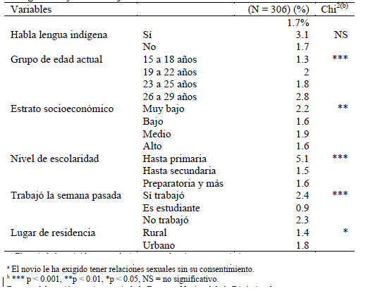 Como puede apreciarse en el Cuadro 2, el análisis bivariado sugiere que la lengua indígena no es una variable estadísticamente significativa en la violación sexual en las relaciones de noviazgo en esta población. Por su parte, la prevalencia de violación sexual en el noviazgo es casi del doble (2.8 por ciento) en el grupo de edad de 26 a 29 años que para el grupo de