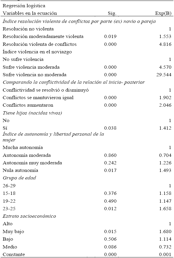 En el modelo antes presentado sólo se incluyeron las variables significativas, e incluso se decidió dejar en el mismo algunas variables si al menos una de sus categorías era estadísticamente significativa. Igualmente, la edad agrupada y el estrato socioeconómico fueron incluidas en el modelo como variables control (para verificar que las diferencias encontradas no se deban a diferencias de edad o de estrato). Como se aprecia en el Cuadro 3, el análisis multivariado indica que los factores asociados (predictores) de la violación sexual entre las mujeres jóvenes (de 15 a 29 años de edad) que son estadísticamente significativos son: tener hijos, la mujer tenga nula autonomía y libertad personal en el marco de la relación de noviazgo, pertenecer al estrato socioeconómico muy bajo, tener una relación de noviazgo problemática desde sus inicios y donde los conflictos vayan en aumento a lo largo de la misma, que éstos sean resueltos por el novio de manera violenta, y el hecho de sufrir otras formas de violencia en la relación de noviazgo.