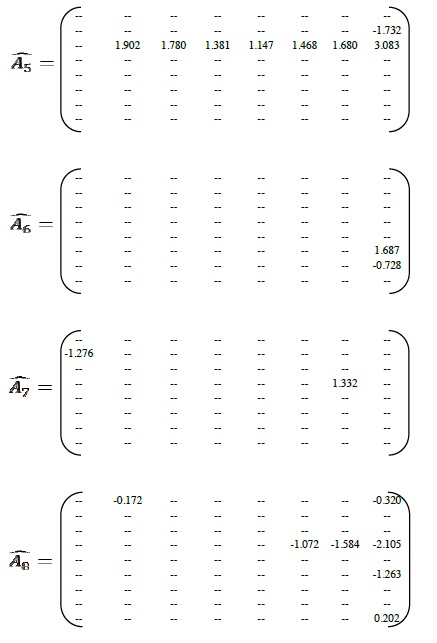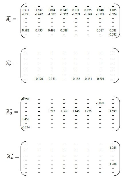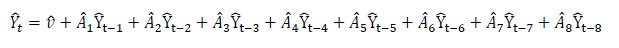 A partir de las series de nacimiento por grupos de edad de la madre, con datos mensuales de 1992 a 2010, se obtuvo que un modelo adecuado para representarlas conjuntamente, a saber un modelo VAR estacionario con ocho retrasos, es decir un VAR(8), donde se utilizó el criterio de Likelihood Radio (LR) para determinar su longitud (se realizó el ajuste en EViews versión 8.0). Entonces, Yt el vector de las series de nacimientos, se estimó con la siguiente estructura