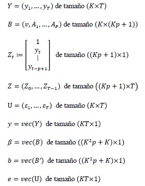 La notación vec(•) es el operador vector columna, para t = 1, …, T, el modelo VAR(p) (Ecuación [2]) puede escribirse de forma compacta como: