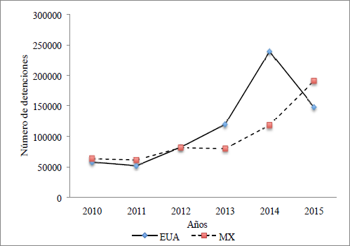 En 2014, por primera vez en la historia reciente, el número de centroamericanos aprehendidos en la frontera sur de Estados Unidos superó el número de mexicanos, representando 53 por ciento de las aprehensiones (Gráfica 1). Otro fenómeno totalmente novedoso fue el aumento significativo de mujeres y niños aprehendidos, que representaron ese año 29 por ciento, frente a 13 por ciento en 2013 (Rosenblum, 2014). En 2015, por primera vez en diez años las detenciones y deportaciones de centroamericanos desde México superaron a las detenciones realizadas por la Patrulla Fronteriza de Estados Unidos.