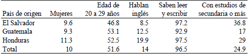 La población migrante guatemalteca se distingue por tener menores niveles de educación, con más de siete por ciento de analfabetismo. Asimismo, una alta proporción de los migrantes guatemaltecos (29.5 por ciento) son hablantes de alguna lengua indígena, mientras que ese porcentaje es de menos de uno por ciento en el caso de los salvadoreños y de 1.5 por ciento entre los hondureños. Los migrantes guatemaltecos son también más jóvenes (27.2 años en promedio) que los salvadoreños (29.5) y que los hondureños (28.8). La mayoría de los migrantes de esos tres países (60.5 por ciento) trabajaba antes de emigrar (El Colef et al., 2013) y las tres cuartas partes provienen de zonas urbanas.