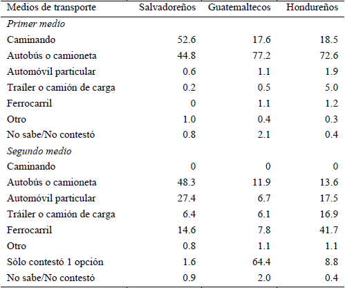 Las entrevistas con migrantes guatemaltecos y salvadoreños devueltos por las autoridades estadunidenses, realizadas en San Salvador y en Ciudad Guatemala en agosto 2013, indican que la mayoría tomó diversos medios de transporte para atravesar el territorio mexicano, incluyendo autobuses de pasajeros, camionetas, tren de carga, largas caminatas, lanchas, tráileres y camiones de carga. Quienes lograron llegar a Estados Unidos sin correr grandes riesgos viajaron generalmente en autobuses de primera y se alojaron en hoteles, pagando sumas de más de ocho mil dólares por el viaje.