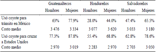 29.8 por ciento de los hondureños y 49.1 por ciento de los guatemaltecos. El uso de intermediarios es más frecuente entre las mujeres tanto para transitar por México como para el cruce de la frontera con Estados Unidos. El costo es también significativamente mayor para las mujeres. En la Tabla 3 se refiere el porcentaje de uso de intermediarios por nacionalidad y por sexo entre migrantes que fueron devueltos a sus países por autoridades migratorias estadunidenses.