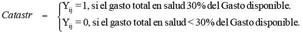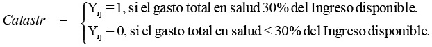 En el modelo que estima la probabilidad de incurrir en gastos catastróficos, se asume que el gasto catastrófico es un evento que ocurre cuando los desembolsos en salud, como proporción del gasto total del hogar, son mayores o igual a 0.3 (OMS, 2000). La incidencia de esta condición es agravada cuando los hogares no poseen algún tipo de seguro; lo que provoca que sean ellos los que financien las consecuencias económicas de una enfermedad y en algunas ocasiones este gasto los orille a perder parte de su patrimonio o bien que se endeuden. La ocurrencia de este evento implica para las familias o los individuos hacer sustituciones entre los distintos rubros de gasto general y el gasto en salud, lo que resulta en cambios en su patrón de consumo. Así, la probabilidad de incurrir en gasto catastrófico está en función de la condición de aseguramiento, es decir si el individuo forma parte del sistema nacional de salud, más una serie de características sociales, económicos o demográficas, propias de los hogares como son la proporción de niños y adultos mayores, pues el estado de salud de éstos es más delicado que el de otros grupos de edad; otros factores muy importantes son el acervo de riqueza o activos del hogar; la zona de residencia.