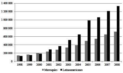 Por su proximidad geográfica, hasta la década de 1990 los marroquíes eran el principal colectivo de extranjeros en el territorio español. Sin embargo, a partir del año 2000 la necesidad de fuerza de trabajo extranjera fue cubierta con nacionales de países de América Latina. La preferencia de los españoles por los latinoamericanos legitimó al gobierno español a poner en marcha una política migratoria que favoreció las entradas de este colectivo. Alegando vínculos históricos, culturales y lingüísticos, el gobierno español aprovechó para dar en América Latina una visión generosa del país, pero en realidad utilizó esta política migratoria para reforzar la expansión de la inversión española en la región.