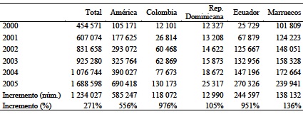 Seguramente la expansión de las empresas españolas en América Latina se vio facilitada por los vínculos históricos, culturales y lingüísticos entre España estos países. Además, el gobierno español utilizó dos instrumentos para potenciar esta expansión: los acuerdos bilaterales en materia de migración y la Ayuda Oficial al Desarrollo (AOD). Por lo que respecta a los acuerdos bilaterales, anteriormente vimos que, durante la última fase de crecimiento económico, y en especial en el período 2000-2005, el gobierno español favoreció la entrada de los latinoamericanos con este instrumento de política migratoria. En el año 2001 España firmó acuerdos migratorios con Colombia, República Dominicana, Ecuador y Marruecos. De esta forma, durante el periodo 2000-2005 los trabajadores extranjeros en España aumentaron un 271 por ciento, mientras que los colombianos se incrementaron 976 por ciento y los ecuatorianos 951 por ciento. Sin embargo, por motivos que posteriormente veremos, los marroquíes solo aumentaron 136 por ciento, muy por debajo de la media (Tabla 2).