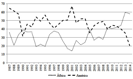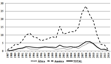 En relación al control de fronteras, para el gobierno español estos planes fueron un éxito, de forma que si en el año 2006, 35 mil clandestinos llegaron por vía marítima, en 2012 solo lo hicieron 4 mil. Ahora bien, es importante señalar que las salidas del continente africano no se han frenado, sino que los migrantes han buscado rutas alternativas y más peligrosas para evitar los dispositivos de control, lo que ha incrementado el número de muertes en el mar. Por lo que respecta a la ayuda al desarrollo española, esta aumentó en aquellos países que colaboraron con el control de las fronteras. Desde el año 2007 el porcentaje de ayuda al desarrollo española en África aumenta y desde 2011 sobrepasa el porcentaje destinado a América (Figura 6).