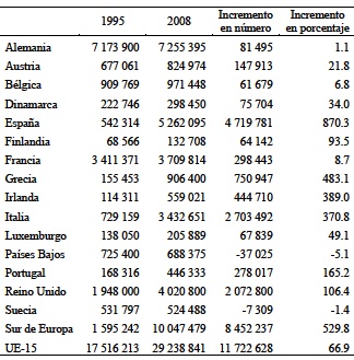 A comienzos de la década de 1990 se inicia una fase recesiva en la economía mundial, que será seguida de una nueva fase de crecimiento a partir de 1995. En esta nueva fase, las economías del sur de Europa registran las tasas de crecimiento más elevadas y las del norte y centro europeo las más bajas. En concreto, durante el período 1995-2008 la economía irlandesa fue la que tuvo la mayor tasa de crecimiento anual acumulativa, en concreto de diez por ciento, seguida de la griega (7.6 por ciento) y de la española (6.9 por ciento), mientras que la menor tasa se registró en la economía alemana (1.9 por ciento).3 Al mismo tiempo, la finalización de la transición demográfica en los países del sur de Europa, con la consiguiente desaceleración en el crecimiento de su población, provocó que la oferta de trabajo interna no fuera suficiente para cubrir las necesidades de la demanda de trabajo de sus economías, por lo que estos países necesitaron recurrir al empleo de fuerza de trabajo extranjera, convirtiéndose en los principales receptores de inmigrantes de la UE-15 (Barou, 2006). Según datos de la estadística Eurostat de la Comisión Europea, durante el período 1995-2008 el número de residentes extranjeros en la UE-15 pasó de 17.5 a 29.2 millones, un incremento de 11.7 millones, de los cuales 8.4 millones se concentraron en los países del sur de Europa (España, Grecia, Italia y Portugal) (Tabla 1).