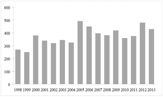 Basada en un estudio de la Organización Internacional para las Migraciones (OIM), la Figura 2 muestra las muertes registradas entre la frontera México-Estados Unidos durante el periodo que comprende de 1998 a 2013. Durante el cual, se observa que a partir del año 2005 en adelante, al menos un migrante al día pierde la vida tratando de cruzar la frontera. Con lo cual, una de las consecuencias de esta política ha sido un marcado incremento en el número de migrantes que mueren tratando de conseguir entrar a Estados Unidos (Tuirán y Ávila, 2010; Massey et al., 2009; 2002; Riosmena, 2009; Cornelius, 2006; 2004; Orrenius, 2004; Andreas, 1999; Eschbach et al., 1999).