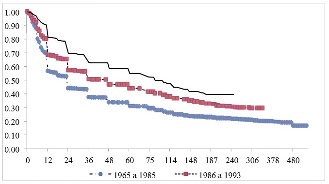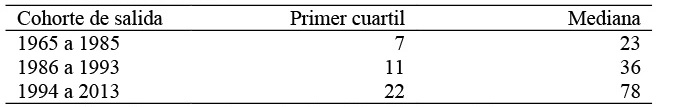 De los resultados de la tabla de sobrevivencia se obtuvo la Tabla 1, la cual muestra los cuartiles del tiempo de sobrevivencia por cohorte de salida de los migrantes indocumentados. En ella se aprecia que 50 por ciento de los migrantes en su primer viaje presentó una mediana de 23 meses de permanencia durante la cohorte 1965-1985, aumentando a 36 meses en la cohorte 1986-1993, para posteriormente terminar con una mediana de 78 meses en la cohorte 1994-2013. Lo anterior representa un aumento en la mediana del tiempo de estancia en el periodo 1986-1993 de 56.5 por ciento con respecto a la primera cohorte de salida, mientras que para el periodo 1994-2013 representa un aumento de 116.7 por ciento en relación a la segunda cohorte de salida. Es decir, la tendencia creciente en el tiempo de permanencia de los migrantes se consolida en la cohorte 1994-2013, periodo que se caracteriza por el reforzamiento de la frontera por parte de Estados Unidos.