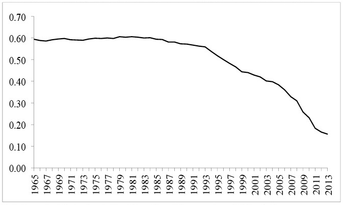 La Figura 5 muestra que una vez controlado los altos costos que se pagan (3 000 USD) por cruzar la frontera de manera indocumentada (los cuales surgen por el reforzamiento de la frontera), así como por las demás variables, la probabilidad de retorno a los doce meses de permanencia para una persona con un perfil migratorio de tipo temporal variaba entre 0.60 y 0.58, durante el periodo de 1965 a 1985, durante el cual el PAPF fluctuaba entre 200 y 338 millones de dólares. Posteriormente a partir de 1986 con el incremento gradual en los riesgos asociados al cruce fronterizo clandestino (PAPF) que se registra durante el periodo IRCA, la probabilidad de retorno a los doce meses disminuyó ligeramente en el tiempo, al pasar de 0.59 en 1986 (PAPF 296.11 millones de dólares) a 0.56 en 1993 (PAPF 526.32 millones de dólares). Sin embargo es a partir de la implementación de la política de militarización de la frontera que la probabilidad de retorno ha caído marcadamente en el tiempo, al pasar de 0.56 en 1993 (PAPF 526.32 MD) a sólo 0.16 en 2013 (PAPF 3 179.84 MD), con lo cual es más probable que los migrantes indocumentados permanezcan en Estados Unidos en vez de retornar a sus comunidades de origen una vez cumplido los doce meses de viaje. Estos cambios en las probabilidades de retorno a partir de 1993, muestran que el aumento en los costos y riesgos de la política de militarización de la frontera ha provocado que los migrantes alarguen su permanencia en Estados Unidos.