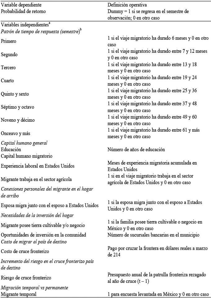 Por otro lado, dado que diferentes trabajos han encontrado evidencia estadística que sustenta que: las característica individuales, hogar, localidad y país afectan a la probabilidad de retorno de los migrantes en Estados Unidos, el modelo econométrico incluye estas dimensiones, asimismo se incluyen una variable de control: lugar en donde se levantó la entrevista (México o Estados Unidos) con el fin de diferenciar a los migrantes temporales de los permanentes.