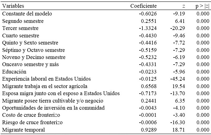 La Tabla 3 muestra los valores de los estimadores de regresión (βi) del modelo de riesgo logit, el cual presenta una bondad de ajuste de 0.70. En relación con el tiempo de permanencia en Estados Unidos y tomando como grupo de referencia los primeros seis meses de estancia en ese país, la probabilidad de retorno aumenta del séptimo al doceavo mes de estancia en Estados Unidos (segundo semestre), mientras que disminuye en los siguientes periodos de tiempo de permanencia. Una mayor educación así como una mayor experiencia laboral en Estados Unidos disminuyen la probabilidad de retorno debido a que permiten el acceso a empleos mejor remunerados, lo cual incentiva el asentamiento de los migrantes en el país de destino. Trabajar en el sector agrícola aumenta la probabilidad de retorno, debido a que en general estos empleos son estacionales, con lo cual los migrantes no pueden hacer frente a los costos fijos que implica una estancia de tipo permanente en Estados Unidos. En cuanto al capital social, si el jefe del hogar migra con su esposa a Estados Unidos, su probabilidad de retorno disminuye.