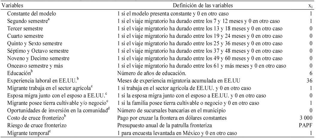 Para calcular el efecto que tiene el aumento de los riesgos asociados al cruce fronterizo clandestino sobre la probabilidad de retorno se sustituye los valores del Presupuesto Anual de la Patulla Fronteriza (PAPF) en la función de probabilidad logit, manteniendo todas las demás variables fijas. Para esto utilizamos los valores de las variables explicativas (xi) que describen un ejemplo de un migrante con características que se asocian con un patrón migratorio de tipo temporal, es decir; la persona tiene una baja educación, trabaja en el sector agrícola de Estados Unidos, su esposa no ha migrado, posee tierra cultivable y/o negocio en México, proviene de una comunidad que permite limitadas oportunidades de inversión, su experiencia laboral en Estados Unidos es de 36 meses y dado que no tiene documentos sus costos de cruce fronterizo en un escenario de reforzamiento de la frontera es de 3 000 USD. Además, es un migrante que ha permanecido en Estados Unidos por doce meses. La Tabla 4 resume estos valores.