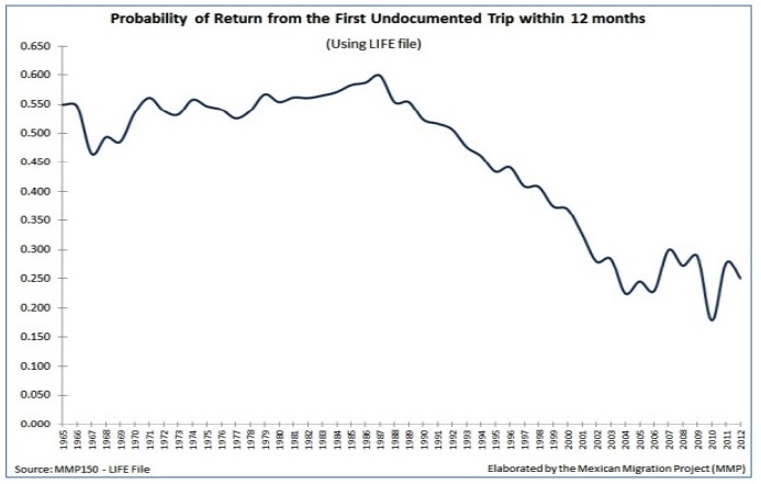 Además de las consideraciones económicas, un aspecto clave para la migración de retorno son los cambios en la política inmigratoria estadounidense. En especial la Immigration Reform and Control Act (IRCA) de 1986, pues constituye un parteaguas para la migración México-Estados Unidos. Consideremos que resulta un punto de inflexión en su dinámica e intensidad, al otorgar estatus legal a grupos de trabajadores indocumentados; el establecer sanciones para empleadores y reforzar la vigilancia en la línea fronteriza. Estos elementos influyen en una menor probabilidad de retornar a México después del primer ingreso no autorizado a Estados Unidos con el paso del tiempo, particularmente desde ese año (1986), según se aprecia en la Figura 1.