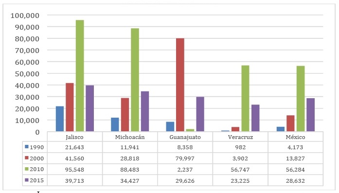 En diversas magnitudes, igual tendencia se observa en todas las entidades del país, encontrándose el Estado de México como la quinta entidad con mayor volumen de este grupo de población en 2010. Incluso en 2015 supera a Veracruz en recepción de migrantes de retorno lo que posiciona al Estado de México en cuarto lugar. De acuerdo con la información que se muestra en la Figura 3, en 2010, le superan Jalisco, Michoacán, Guanajuato y Veracruz. Cabe señalar que para la entidad mexiquense, el grupo de población en estudio (migración de retorno) pasó de 4 173 personas en 1990, a 13 827 en 2000, 56 284 en 2010 y 28 632 en 2015. Es decir, creció 4.1 veces en entre 2000 y 2010, aunque en 2015 haya disminuido los niveles de migración de retorno aún son elevados. No obstante, el mayor incremento de la década se observa en entidades como Chiapas (20.9 veces), Veracruz (14.5 veces) o Tabasco (11.5 veces). Lo que sugiere una relación con la oleada migratoria reciente.