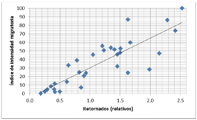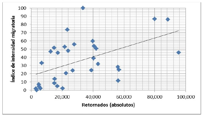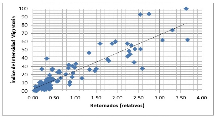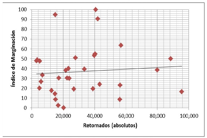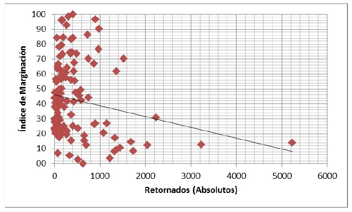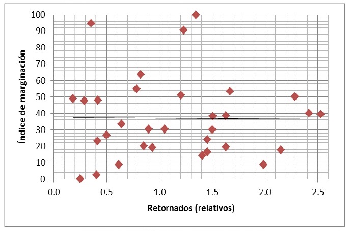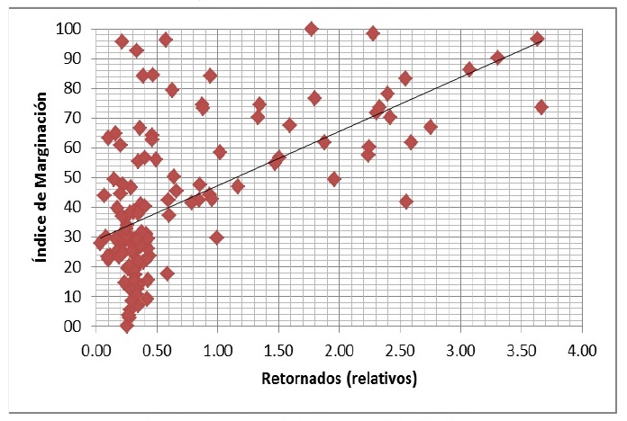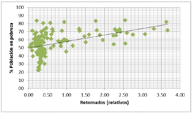 Con base en ello hemos aventurado algunas hipótesis relacionadas con la migración de retorno con la intensidad migratoria, la marginación y la pobreza. Con base en la intensidad migratoria se sostiene que hay una relación positiva con la migración de retorno, y una débil con la pobreza y el caso de la marginación no existe como tal.