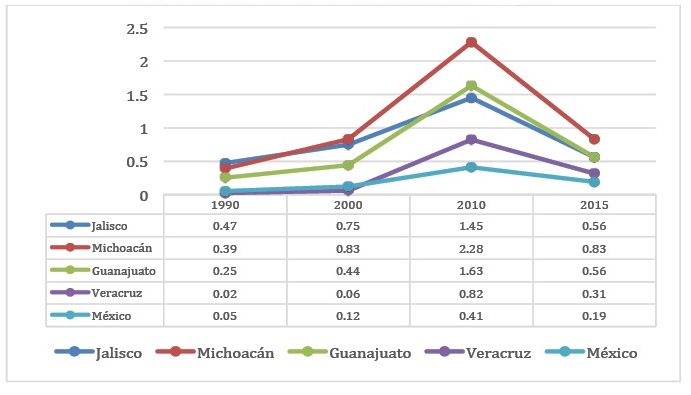 No obstante, también se aprecia el incremento en las cinco entidades incluidas en la Figura 4, particularmente en los periodos incluidos 1990-2010, en el periodo 2010 a 2015 hay una disminución general de la migración de retorno sin llegar a los niveles observados en 1990 y tampoco los observados en el año 2000.