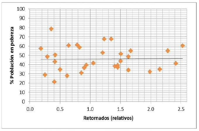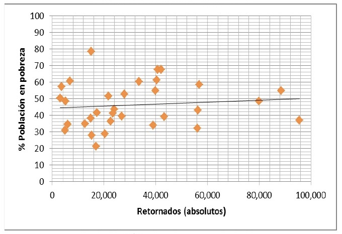 Patrón similar se observa en los diagramas de dispersión entre nuestros indicadores de migración de retorno y el porcentaje de población en pobreza de las 32 entidades federativas mexicanas (Figura 11, Figura 12), pues las correlaciones de Pearson igualmente son muy bajas y sin significancia estadística (Tabla 1).