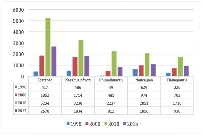 De los municipios de la entidad, Ecatepec, Nezahualcóyotl, Chimalhuacán, Naucalpan y Tlalnepantla son lo que reciben más personas de cinco años o más provenientes de Estados Unidos. Como ocurre en el contexto nacional, se trata de una tendencia en crecimiento tanto en números absolutos como en números relativos, que ocurre en prácticamente todos los municipios de la entidad.6 Sin embargo, para 2015, en los mismos municipios mencionados se registra una disminución de población retornada, reflejo de la tendencia nacional.