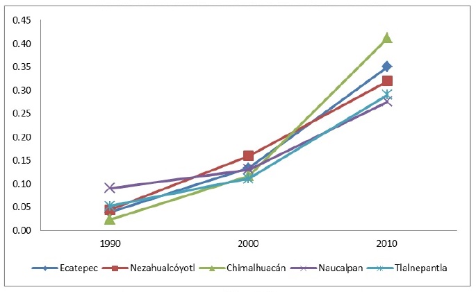 La carencia de información detallada impide abordar el fenómeno en toda su amplitud, sin embargo, nos lleva a buscar aproximaciones para su estudio. Una de ellas tiene que ver con su referente geográfico, y la posibilidad de estudiar el fenómeno con datos agregados por municipio (Terán, Giorguli y Sánchez, 2013). Aproximación de las que nos interesa el análisis de los cambios ocurridos en los municipios metropolitanos del Estado de México en el periodo 2000-2010.
