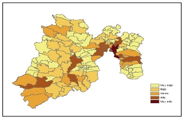 Para tener un panorama más amplio sobre las tendencias presentes en el conjunto de los municipios de la entidad,7 en el Figura 15 se puede observar que la mayor parte de los municipios con Muy alto y Alto grado de migración de retorno en términos absolutos se encuentran algunos conurbados con la Ciudad de México (Ecatepec, Nezahualcóyotl, Chimalhuacán, Naucalpan, Tlalnepantla, Tultitlán, Tecámac, Ixtapaluca), así como Toluca, Villa Guerrero y Tejupilco.