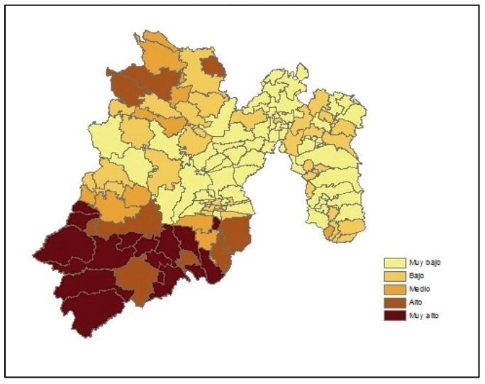 En lo que toca a la migración de retorno en términos relativos, predominantemente se trata de municipios en la zona sur-oeste de la entidad, entre los que se cuentan Almoloya de Alquisiras, Luvianos, Tlatlaya, Amatepec, Coatepec Harinas, Villa Guerrero, Tonatico, Zumpahuacán, Tejupilco, Otzoloapan, Texcaltitlán, San Simón de Guerrero, Zacualpan, Santo Tomás y Joquicingo (Figura 16).