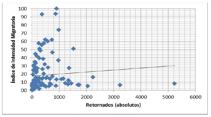 En la Figura 17 puede observarse el diagrama de dispersión entre el IIM (base 100) y el volumen de retornados por municipio. Como se aprecia, la relación entre ambos indicadores es positiva en cierto grado, y se observa importante concentración de los valores por debajo de 500 personas retornadas. Sin embargo, la correlación de Pearson entre ambos indicadores es muy baja y no es estadísticamente significativa (Tabla 1).