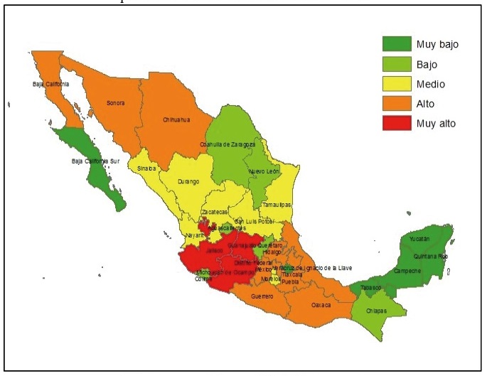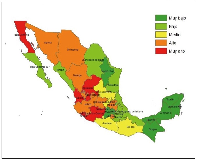 Para una mejor apreciación de lo que ocurre en el contexto nacional y solo para 2010 (que es el año en que se registró el mayor volumen de migrantes de retorno), se agrupa a las entidades del país para generar un Grado de Migración de Retorno.4 En la Figura 5 se observa que el Estado de México se encuentra, como ya mencionamos, entre las entidades con alta incidencia del fenómeno migratorio en términos absolutos. En términos relativos, en cambio, se encuentra entre las entidades con muy baja incidencia, como se muestra en la Figura 6.