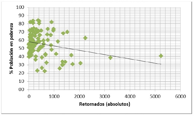 Patrón similar se observa en los diagramas de dispersión cuando se contrasta la migración de retorno y el porcentaje de población en pobreza (Figura 21, Figura 22). Las correlaciones de Pearson igualmente son estadísticamente significativas, así como baja en el caso del volumen de retornados (-0.255) y moderada para la proporción de retornados (0.480), como igualmente puede apreciarse en Tabla 2.