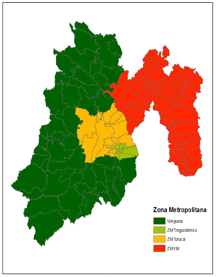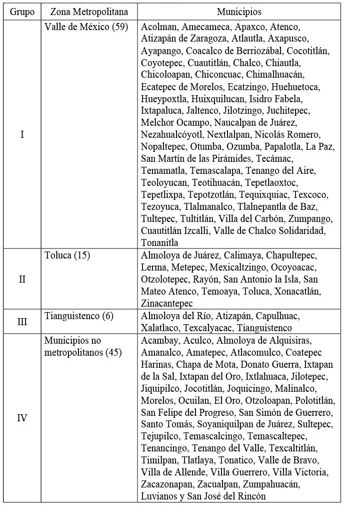 De acuerdo con la delimitación de zonas metropolitanas más reciente, en el Estado de México 80 (64 por ciento) de los 125 municipios son metropolitanos. La Zona Metropolitana del Valle de México (ZMVM) comprende 59 (47. 2 por ciento) de los mismos, 15 (12 por ciento) la ZM de Toluca y seis (4.8 por cienti) la ZM de Tianguistenco. Existen además 45 municipios no metropolitanos. Se trata de cuatro grupos de municipios que se enuncian en la Tabla 3.