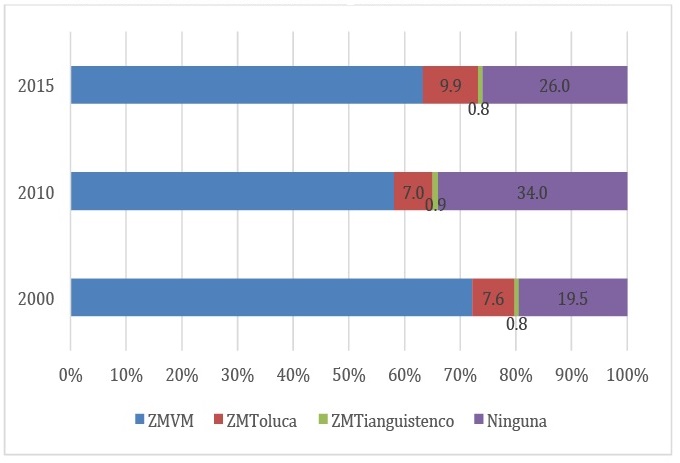 En dicha figura se aprecia que del total de migrantes de retorno en 2000, 72.2 por ciento se asentaron en la ZMVM, 7.6 por ciento en la ZM de Toluca. 0.8 por ciento en la ZM de Tianguistenco y 19.5 por ciento en municipios no metropolitanos. En cambio, en 2010 los valores cambiaron a 58.1, 7, 0.9 y 34 por ciento, en el mismo orden. Esto es, una mayor proporción eligió como destino a los municipios no metropolitanos, disminuyendo sobre todo la proporción que eligió como destino la ZMVM, pues en el caso de la ZM de Toluca y la ZM de Tianguistenco el diferencial no es tan amplio. Sin embargo, en 2015, la ZMVM vuelve a surgir como un espacio al cual los migrantes retornados arriban, lo mismo sucede con la ZM de Toluca. Es en el conglomerado de municipios no metropolitanos que disminuye el porcentaje de población retornada que arriba a ellos. Aun con todos estos cambios no hay que perder de vista que es la ZMVM la que en los tres años de referencia capta el mayor porcentaje de población retornada a la entidad mexiquense, esto mismo aplica a los municipios no metropolitanos como segundo receptor de migrantes retornados.